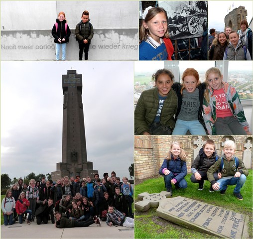 Twee gidsen leidden de 35 leerlingen in twee groepen (klas van juf Lynn Dusoir en van juf Fabienne Viaene) twee uur buiten en in de Ijzertoren rond. Ze vertelden over de grote oorlogsgeschiedenis, maar vooral, specifiek, over de gebeurtenissen aan de Ijzer, kleine geschiedenissen ook, over gewone mensen, soldaten en burgers, moeders en kinderen, vluchtend ook voor het geweld. Over de graven in de crypte hadden ze het, over Frans en Edward van Raemdonck, 20 en 22 waren ze in 1917, toen ze niet ver van elkaar aan het front stierven, niet in elkaars armen, zoals Brugse schilder Joe English het, verheerlijkend, op een tekening voorstelde, die later op een brandglasraam werd voorgesteld.