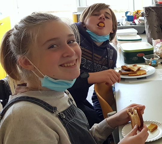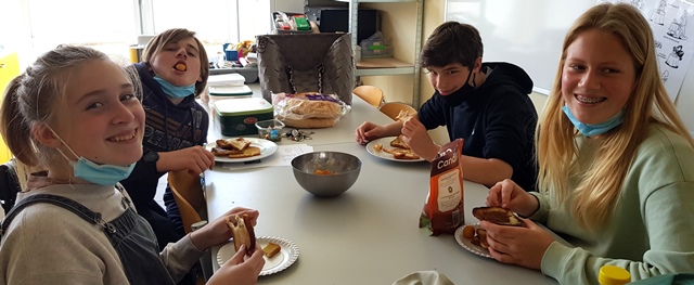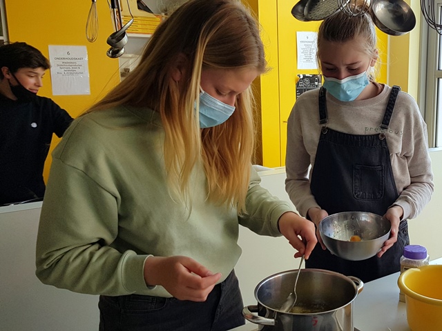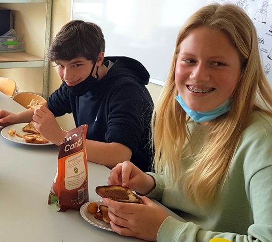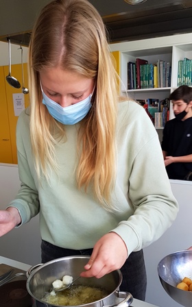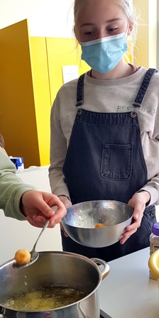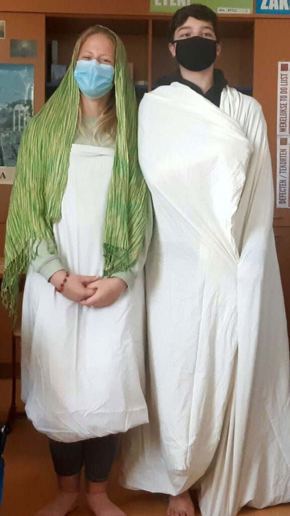 Lerares Latijn Sara Huysman laat ons weten: De leerlingen maakten ‘globi’ en Romeinse wentelteefjes. Globi zijn een soort Romeinse oliebollen, die Romeinen als dessert aten. Ze zijn gemaakt op basis van griesmeel en ricottakaas. Voor het koken hebben we een Romeins huwelijk nagebootst.