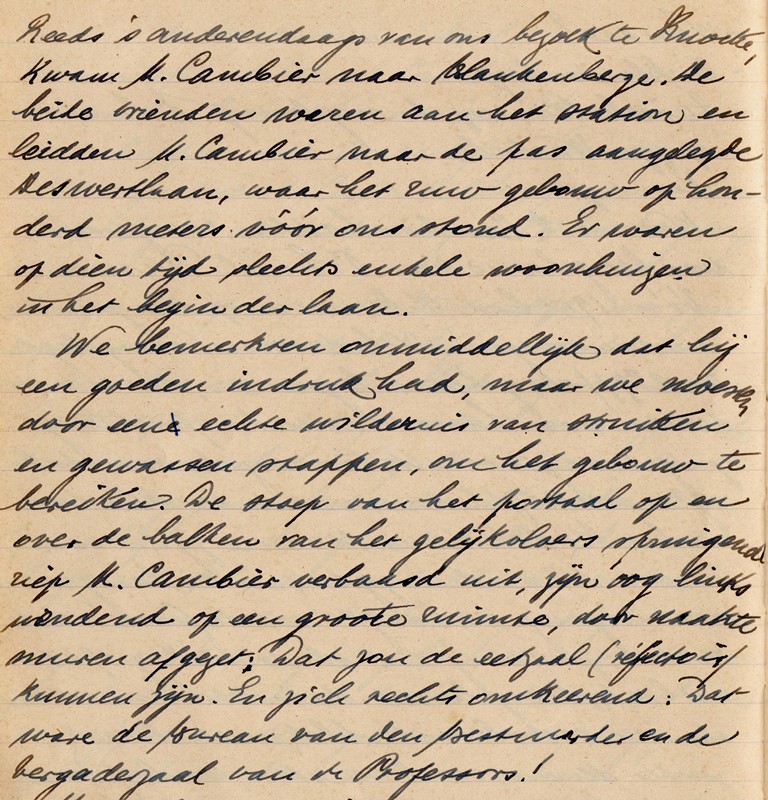 We bemerkten onmiddellijk dat hij (Cambier) een goeden indruk had, maar we moesten door eene echte wildernis van struiken en gewassen stappen om het gebouw te bereiken…