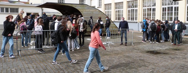 De leerlingen van de 2de graad kunnen het gebouw pas betreden vanaf 8.25u., via de gepaste looplijnen. Ze wachten op onze speelplaats in de daartoe voorziene wachtzone. De lessen starten voor hen om 8.30u., het gewone lesuur.