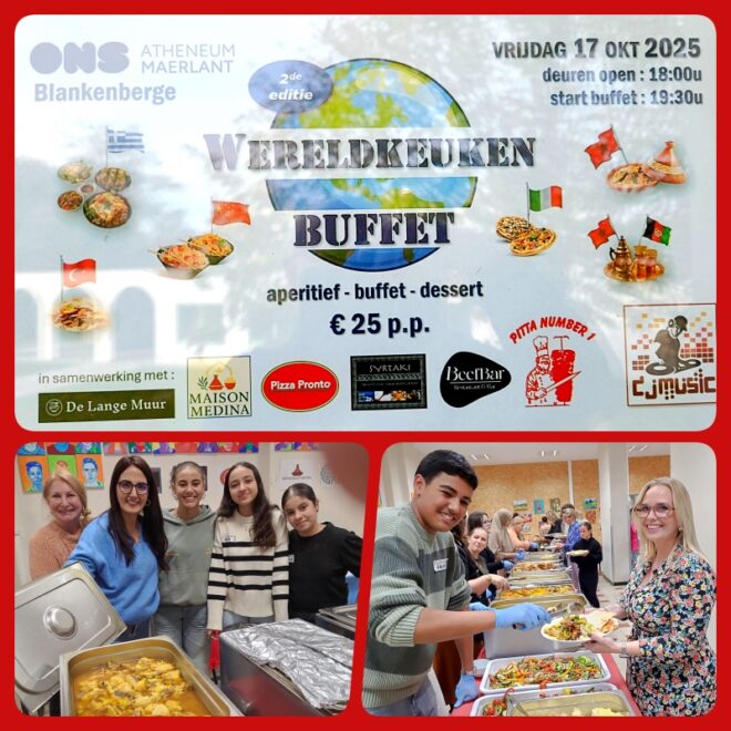 Op 17 oktober WERELDKEUKENBUFFET in het schoolrestaurant van het Maerlant-atheneum…in het kader van de lessen wereldkeuken en diversiteit. Allen van harte welkom. Inschrijven via: https://forms.gle/3wvGRRfNr1dJxdje9.