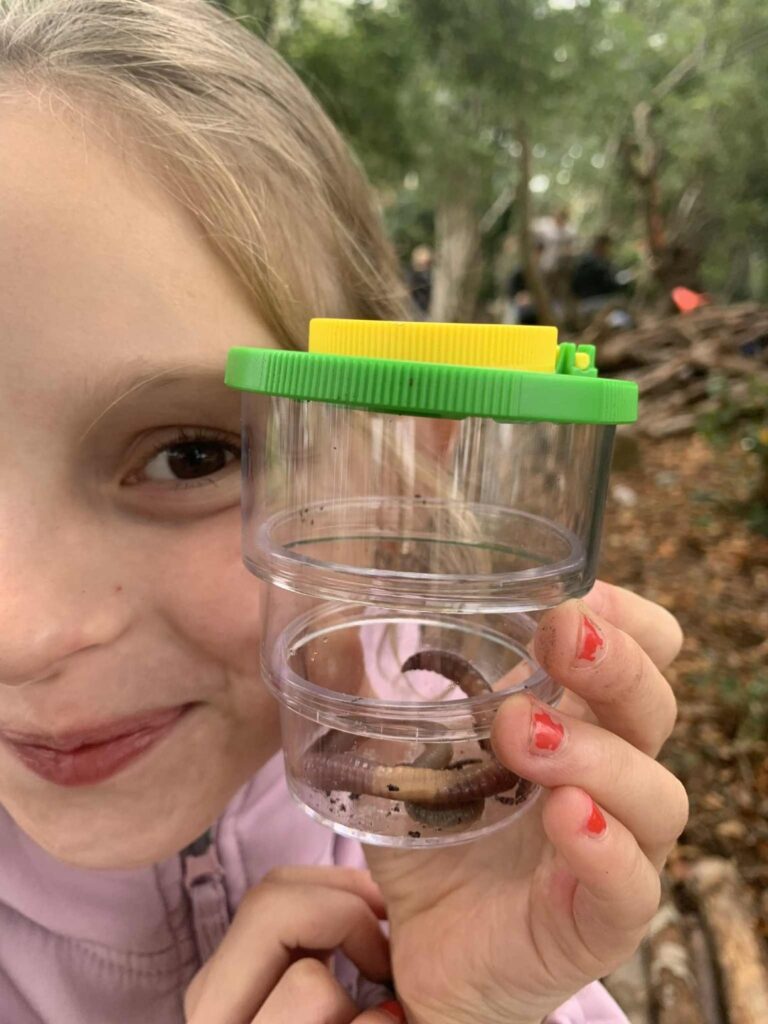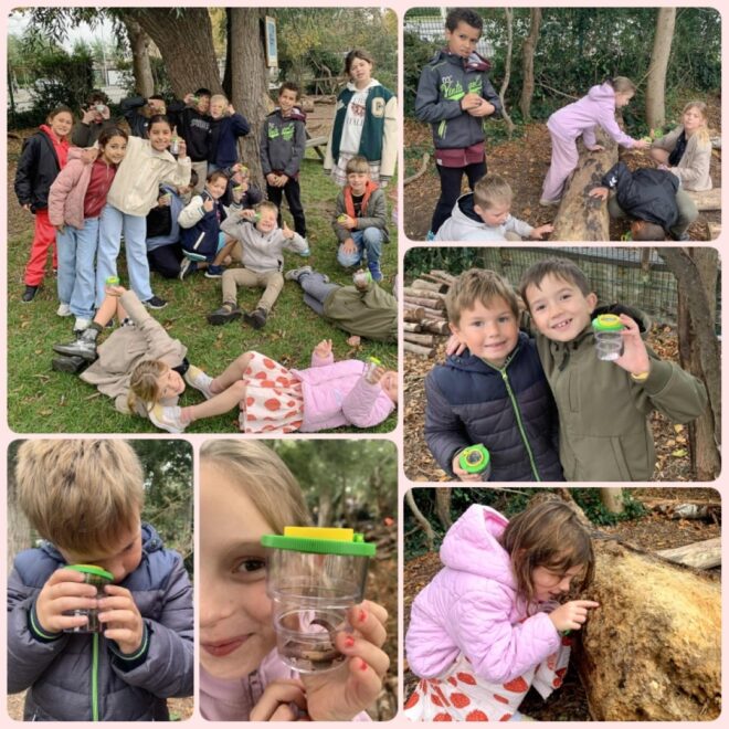 ‘Nina Natuur’ gaf ons nieuwe loeppotjes waarmee we ‘Kriebeldiertjes’ van heel dichtbij kunnen bekijken. Het derde leerjaar testte ze vandaag even uit op onze groene speelplaats en ze werden goed bevonden. En we vonden heel wat! Wat vind je o.a. van deze kanjer van een regenworm die Joanna ons heel trots toont?“