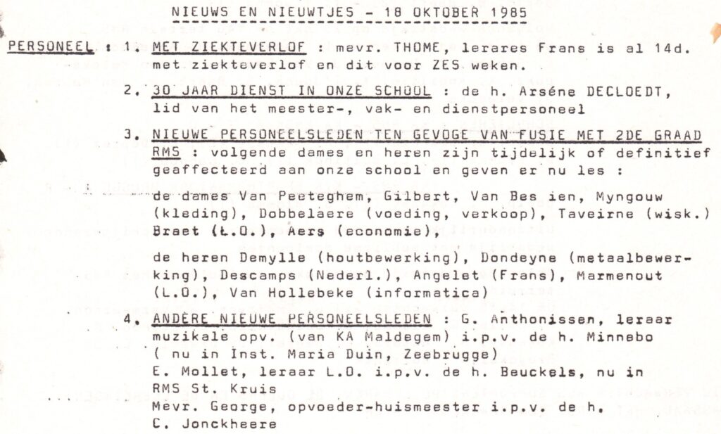 Er waren toen heel wat nieuwe leerkrachten nodig: de dames Hilde Van Peteghem, Winnie Van Besien, Eveline Dobbelaere, Martine Taveirne, Thérèse Braet, Josiane Aers – de heren Robert Dondeyne, Yves Descamps, Albert Angelet, Gilbert Marmenout, Van Hollebeke en ook Lieve George. Toen waren Rudy Rydant en Verhulst directeur, resp. van RMS en KA Blankenberge
