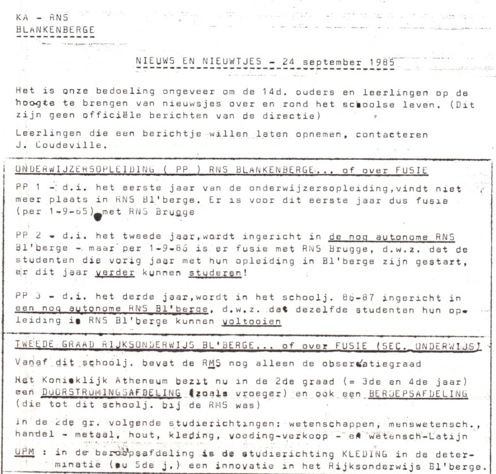 2. Vanaf sept. 1985 bevat de RMS Bl’b alleen nog de observatiegraad. Het derde jaar en het vierde jaar heten nu doorstromingsgraad en de leerlingen van die graad krijgen les in de Van Maerlantstraat, in het KA. Alle beroepsleerlingen krijgen verder les in de Onderwijsstraat, in dat mooie gebouw uit 1883, dat nu de Stedelijke Bibliotheek huisvest.