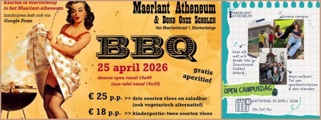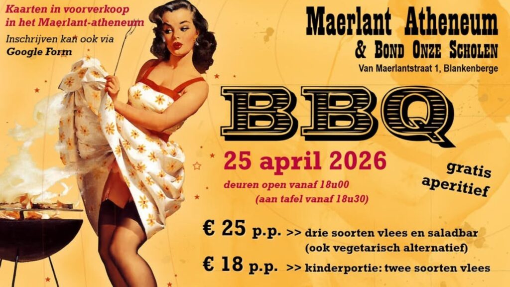 Bond Onze Scholen en ONS Maerlant-atheneum Blankenberge nodigen u vriendelijk uit op de jaarlijkse barbecue op ZATERDAG 25 APRIL 2026. Wij openen onze deuren om 18.00u.