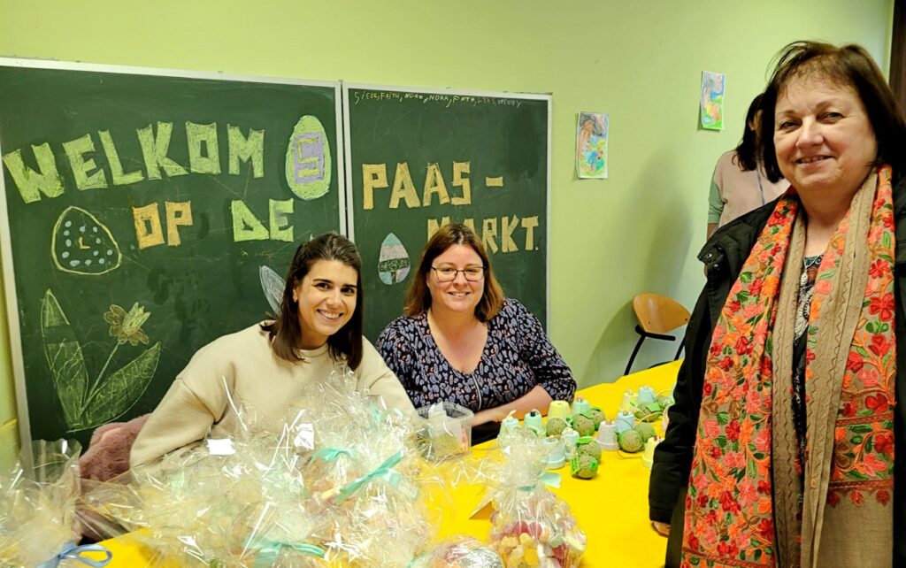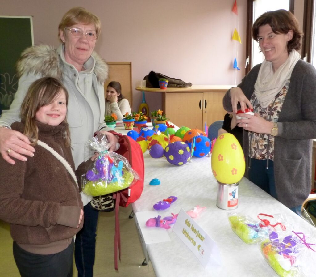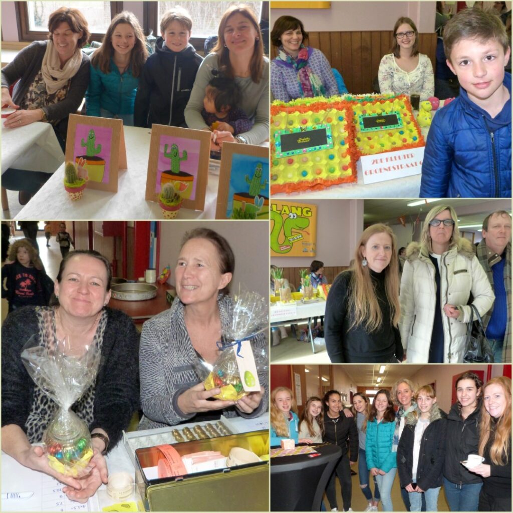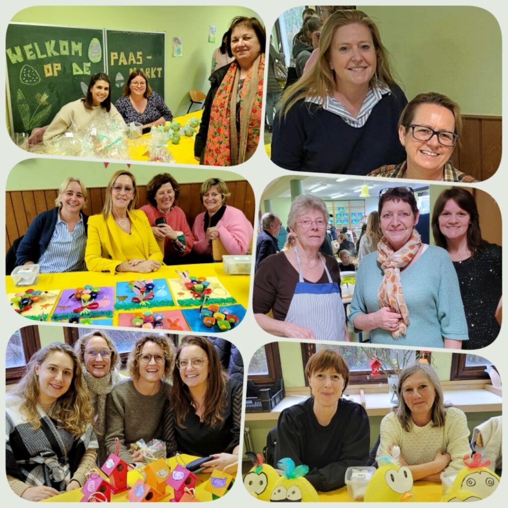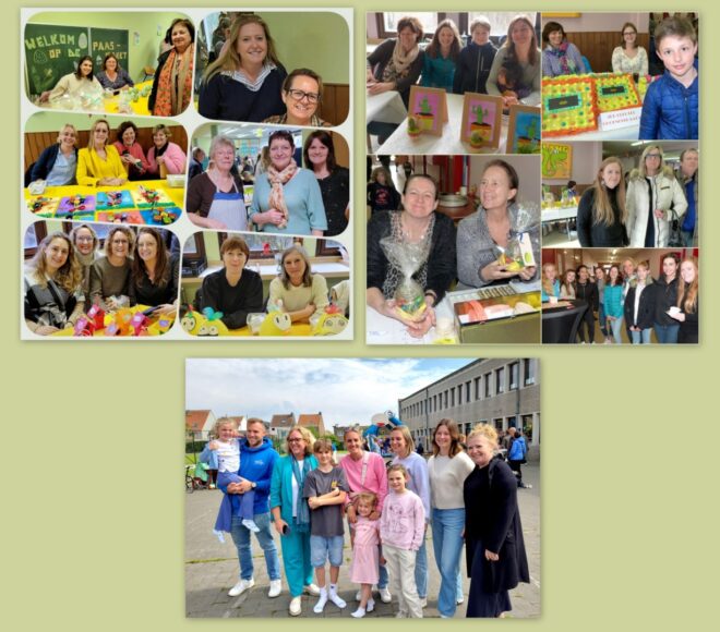 Op de PAASMARKT in locatie UITKERKE kon men allerlei kunstwerkjes kopen, die de leerlingen in de klas hadden gemaakt. Men kon er gezellig een drankje drinken en een praatje slaan. We deden dit met enkele oud-leerlingen, ouders én met oud-leerlingen van het Maerlant-atheneum,, die even hun vroegere juffen kwamen groeten. In 2025 zijn schoollocatie en schoolgebouw verdwenen. We herinneren ons de locatie met heimwee.
