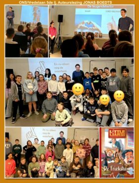 Lln. 5de lj. ONS/VREDELAAN woonden in de Stedelijke Bibliotheek auteurslezing van JONAS BOEDTS bij. Maerlant-oud-lle 1985 Inge Desutter leidde hem in.