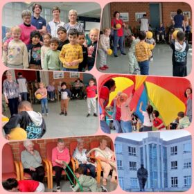 KLEUTERS ONS/VanMaerlantstraat in wzc De Strandjutter, waar ze met kinesitherapeut, vrijwilligers Anne Debruyne en Marleen Tavernier (vroeger kleuterleidster d’Oefenschool) en bewoners gym-en sportles meemaken.