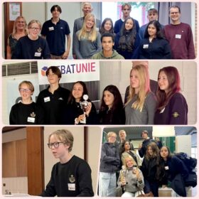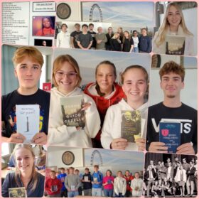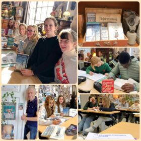 WEEK VAN HET NEDERLANDS (3 tot 12 okt.) . Maerlant-oud-leraar Nederlands Jaak Coudeville leest 59 j. na zijn eerste les in KA Maldegem) in het tweede j., klas F1 van het Maerlant tijdens de les van Bubbe Marmenout enkele gedichten voor…van G. Gezelle tot L. Ma Neza. Tien van de eenentwintig leerlingen vonden EEN LIED DER BLIJDSCHAP (B. Decorte) het mooiste.