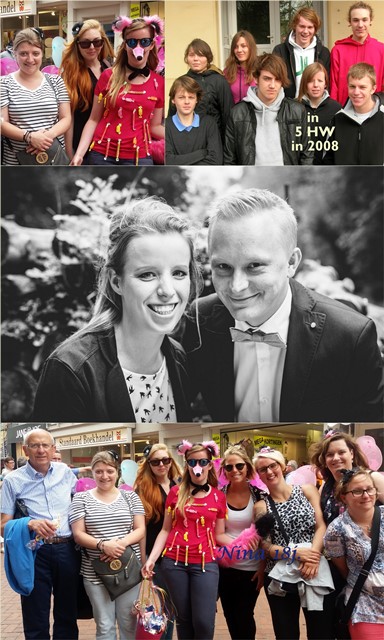 We wandelden door de Blankenbergse Kerkstraat en werden opgehouden door een groepje twintigsters, die snoepjes verkochten t.v.v. het vrijgezellinnenfeest van oud-leerlinge Anouschka Coppens die begin sept. trouwt met Benny Vereecke (ook oud-ll.)