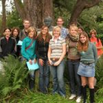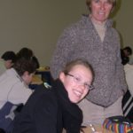 Fotocollage: foto o.l. op een examen wiskunde (met Martine Taveirne, Julies tante, in 2004  –  foto o..r. tuin van het Gezellemuseum Brugge, sept. 2006