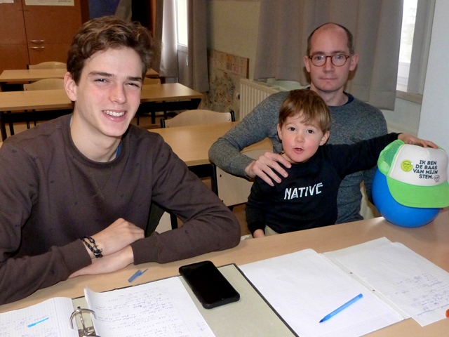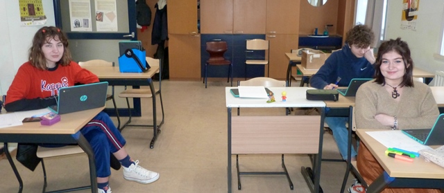 De drie deelnemende leerlingen: Maxim Deschamps, Gaël Van Hulle, Gabriele Tsatourova. Leraar Olbren Depaepe, fysicus, was bij hen.