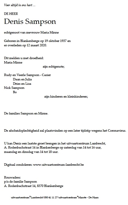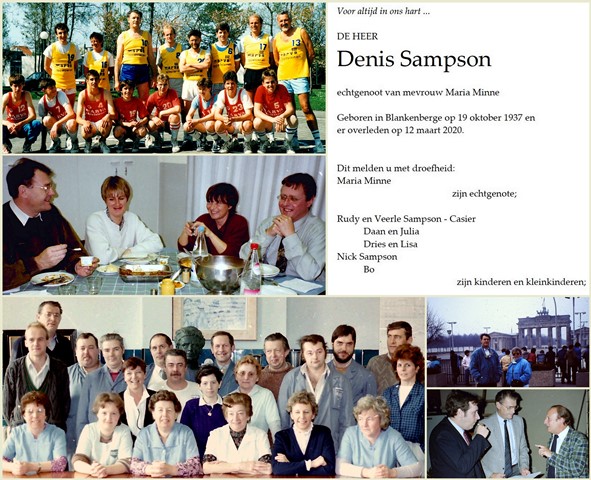 Denis Sampson werd in 1957 onderwijzer in de Rijksnormaalschool Blankenberge, samen met nog 40 anderen. Herman Naert, die later pedagoog werd, was een klasgenoot; Jaak De Reese, oud-onderwijzer (vooral 4de lj.) d’Oefenschool ook. Beiden zijn overleden. Oud-onderwijzer d’Oefenschool Fernand Denys zat ook in zijn jaar. Ook de bekende kunstenaar Cy Frimout, broer van Dirk, werd in dat jaar in Blankenberge onderwijzer.Ik leerde Denis Sampson in 1971 kennen als (intern) studiemeester, zorgend voor een goede sfeer bij de internen. Later werd hij verantwoordelijk voor het economaat. Hij maakte het directeurschap mee van Virgile De Maesschalck, Roger Descamps, Fernand Kesteloot, Mertens, Eric Verhulst, Ronald Vanquaethem, Patrick Van Calenbergh. Voor en na de val van de Berlijnse Muur ging hij mee op schoolreis (met filmcamera in de hand), samen met Mimi, zijn vrouw, naar de boeiende Duitse hoofdstad