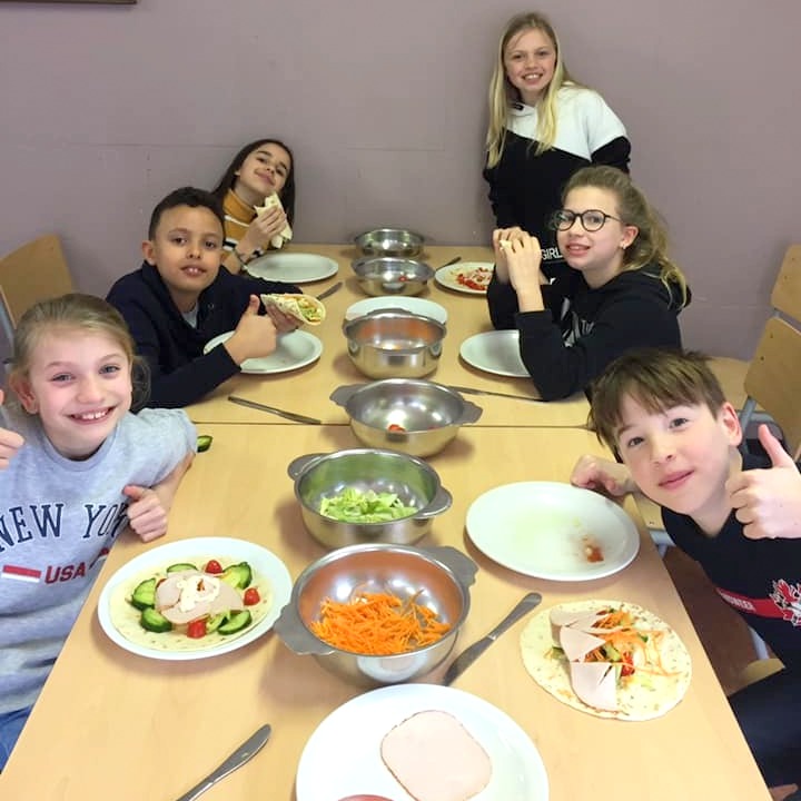 Juf Sofie Easton schrijft me: “Tijdens deze (Steam)week was er om de dag fit te starten een beweegmoment, georganiseerd door de leerlingenraad. Er werd ook klassikaal boodschappen gedaan om soep te maken, er werden bananenpannenkoeken gebakken, gezonde wraps gemaakt, fruitsalade, wortelfrietjes, gezonde drankjes, gezonde popcorn,…er werd dus veel gesmuld!