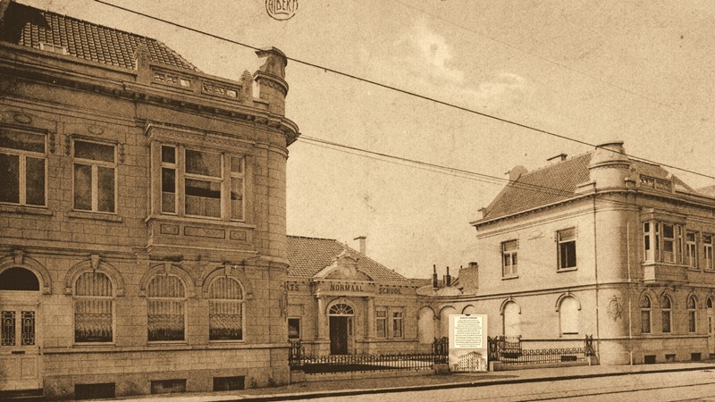 Maar er staat er geen. In de binnententoonstelling in De Meridiaan is bovendien het jaartal van de stichting van de Staatsnormaalschool (zo was toen de naam) verkeerd: