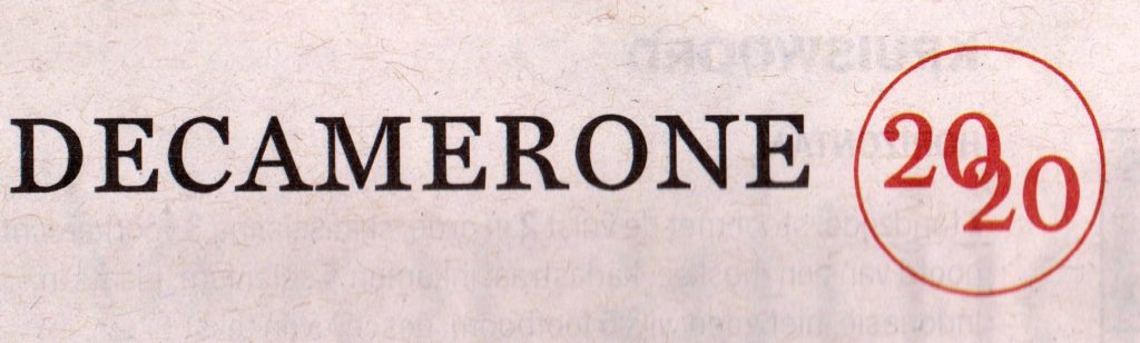 Boccaccio schreef de DECAMERONE bijna 700 jaar gelden, ten tijde van de pest. Het is een boek van de quarantaine, vele honderden bladzijden dik. Het stelt een rij nooit gehoorde verhalen voor, die tien jonge edellieden, die voor die Zwarte Dood uit Florence en naar het platteland vluchtten, aan elkaar vertelden. Een raam verhaal.