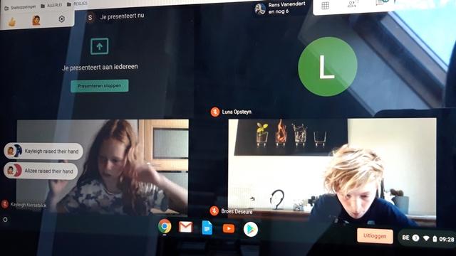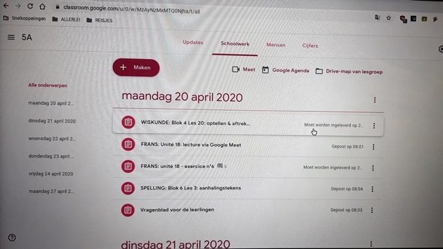 Ik heb vandaag een les wiskunde, taal en Frans gegeven maar ik heb geen opnames aangezien alle 32 leerlingen aanwezig waren. Ik ben een trotse juf! De taken en opdrachten van de leerlingen staan klaar op Google Classroom. Elke dag om 9 uur spreken we live af en krijgen ze instructie, vervolgens gaan ze uiteindelijk zelf aan de slag.