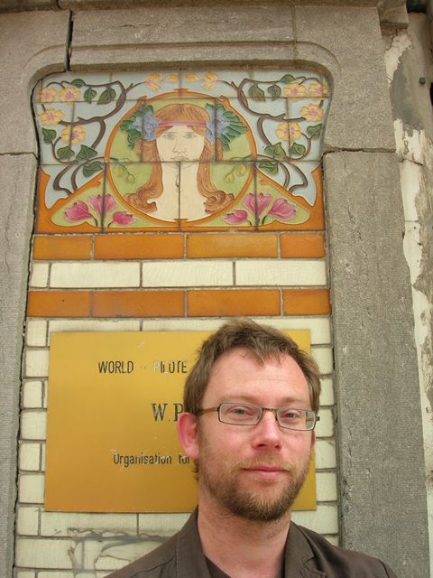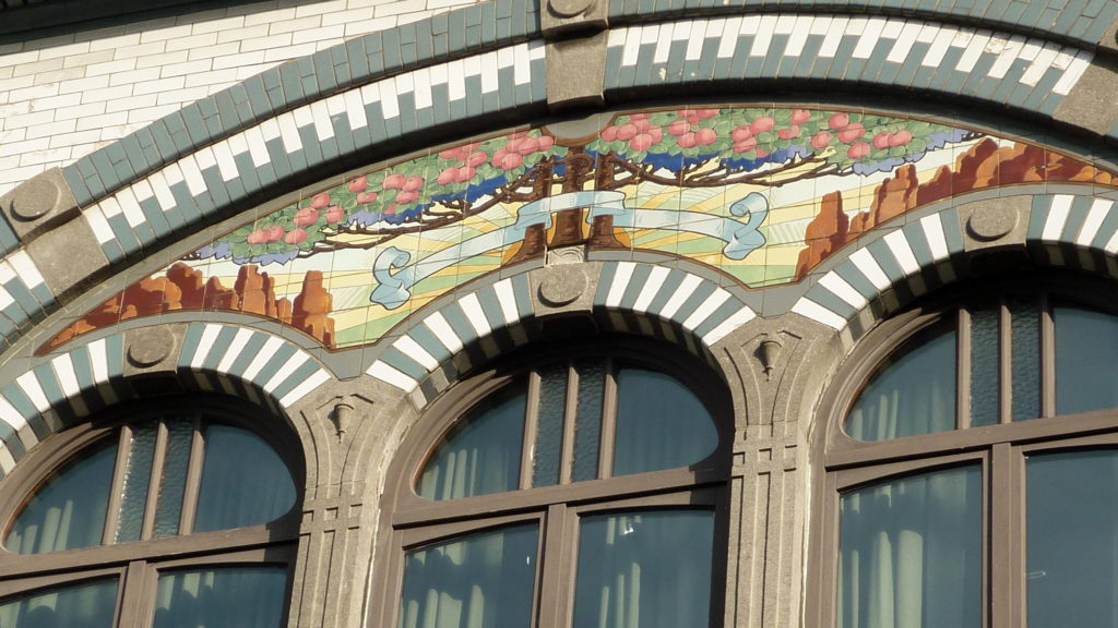 of door het benedenraam van het casinogebouw een gerestaureerd tegeltableau.