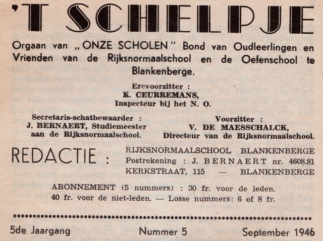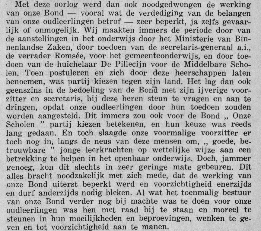 In een toespraak op de vierde oud-leerlingendag (2 juni 1946) , de eerste sedert de bevrijding, waar meer dan 100 oud-leerlingen waren,had de secretaris van de Bond Onze Scholen, J. Bernaert het over de ‘huichelaar De Pillecijn…In 1946 was Virgile De Maesschalk directeur en voorzitter van de Bond Onze Scholen.