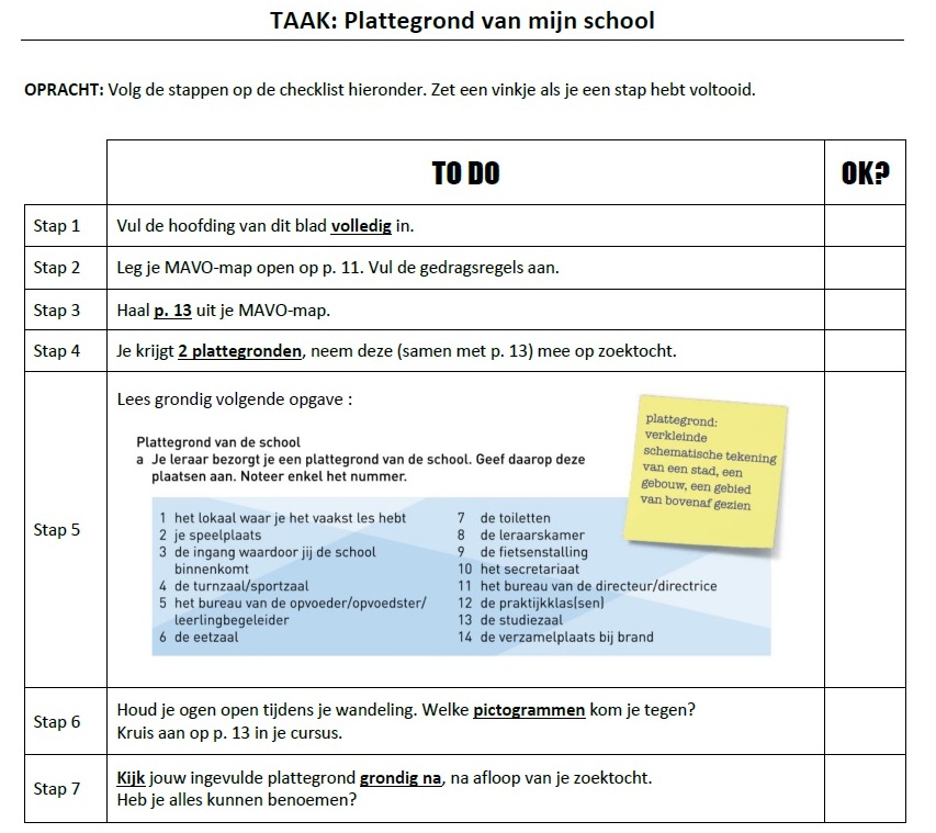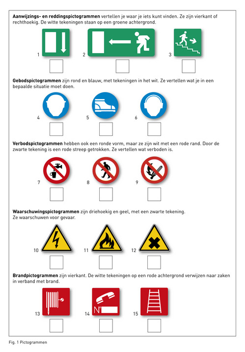 . Bijkomend kregen ze de opdracht om goed uit te kijken naar pictogrammen in het gebouw (brandpictogrammen, gebods-, verbods- of waarschuwingspictogrammen. Als ze een pictogram vonden, mochten ze deze aanvinken op het blad om ze later allemaal te benoemen.
