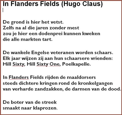 11 Nov.: Een Claus-WO1-gedicht voor Nederlanders…loopgraven zijn darmen van de dood en kronkelgangen van verharde zandzakken en boter uit de Westhoek smaakt naar klaprozen. Het gedicht verscheen in AVENUE in 1968. Het stond in Suite Flamande.