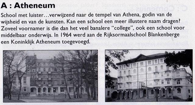 School met luister…verwijzend naar de tempel van Athena, godin van de wijsheid en de kunsten. Kan een school een meer illustere naam dragen? Zoveel voornamer is het woord dan het veel banalere ‘college’, ook een school voor middelbaar onderwijs. In 1964 werd aan de Rijksnormaalschool een Koninklijk Atheneum toegevoegd.