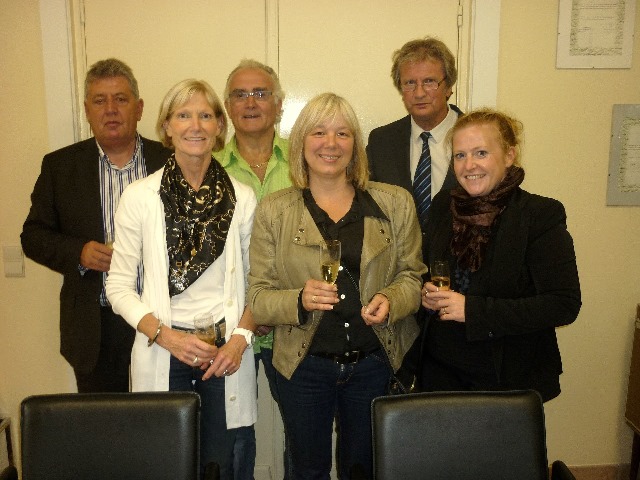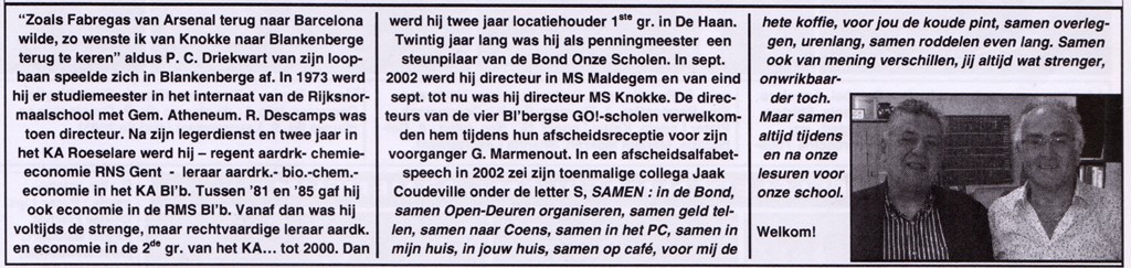 We ontmoetten na de plechtigheid vele oud-collega’s uit het Blankenbergse en Knokse GO! en uit de Scholengroep Impact. Oud-directeurs Patrick Van Calenbergh, Christiane Helders, Gilbert Marmenout en Ludo Suvée brachten er een laatste groet. De beide directeurs van het Maerlant-atheneum, Shirley Adam en Jürgen Balbaert ook. Voorzitter en oud-voorzitters Bond Onze Scholen Peter Lips, Monique Devisscher en Willy Praet eveneens.