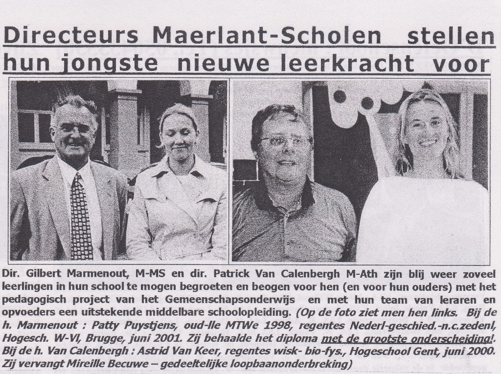 20 jaar geleden werd Astrid Van Keer, regentes wiskunde/biologie/fysica, lerares in het Maerlant-atheneum. Zij is echtgenote van directeur J. Balbaert en de moeder van Johannes Balbaert, straks leerling in de 3des, en van Hermes Maes, oud-leerling Litouwen 2002 Inleefreis met 7 BSO naar Krakau coteachint IS DI EEN MENS 5P. Levi)