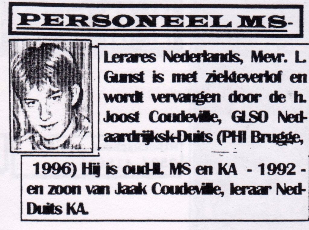 Joost Coudeville is de zoon van Gaby Van Rolleghem, die vaak extra Nederlands les geeft aan anderstaligen in d’Oefenschool en van Jaak Coudeville, tussen 1971 en 2004 leraar Nederlands/Duits in het Maerlant.