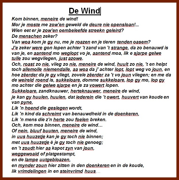 Oud-lle Inga Scharley las Jeanne Vande Puttes gedicht in het Blankenbergs DE WIND voor. Mieke Vandaele las enkele andere teksten voor.