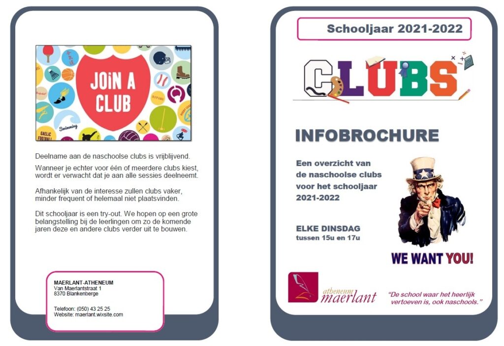 Op dinsdag 14-09 zijn alle leerlingen uit 3Doorstroom en 3Dubbele Finaliteit (uitgezonderd de sportleerlingen) geïnformeerd over de CLUBS die dit schooljaar zullen aangeboden worden. Ze ontvingen toen ook een infobrochure en een bevraging over hun interesse in deze clubs.. Zo waren de Sport Club en de Drama Club de populairste keuzes. Alle betrokken leerkrachten, of clubmasters zoals we hen noemen, zullen vanaf 5 oktober een voorbeeldsessie van hun club geven. Alle bovengenoemde leerlingen zijn dan welkom.