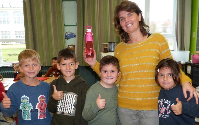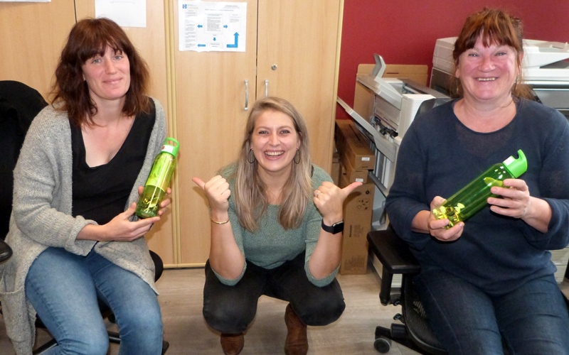 Directrice Lindly Van Reck schonk elk personeelslid een fles met een boodschap (herinnerend aan de film MESSAGE IN A BOTTLE) én met lekkere snoepjes