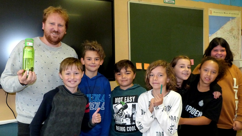 05/10: In d’Oefenschool, lagere, DAG VAN DE LERA(A)R(ES) … in wier/wiens vermogen om de vonk te doen overslaan wij vertrouwen, in wier/wiens liefde voor de lege plek wij geloven, één van de lege plekken waarin de schoonheid ligt. FLESSENPOST is het geschenk van directrice Lindly Van Reck