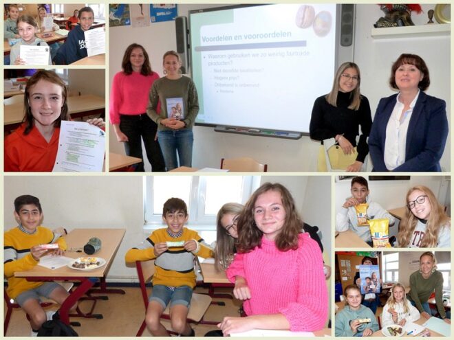 Naar aanleiding van de week van de fair trade kwamen gemotiveerde leerlingen 6des uit de leerlingenraad – Sofie Stockman en Kimberly Cleymans– a.d.h.v. een powerpoint, die ze zelf gemaakt hebben, uitleggen wat fair trade is en wat het belang ervan is. De leerlingen mochten enkele faitradeproducten proeven.
