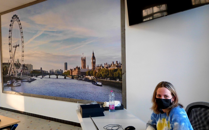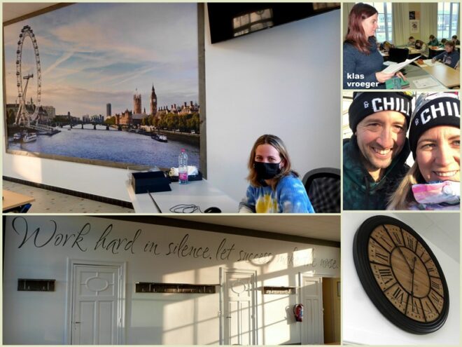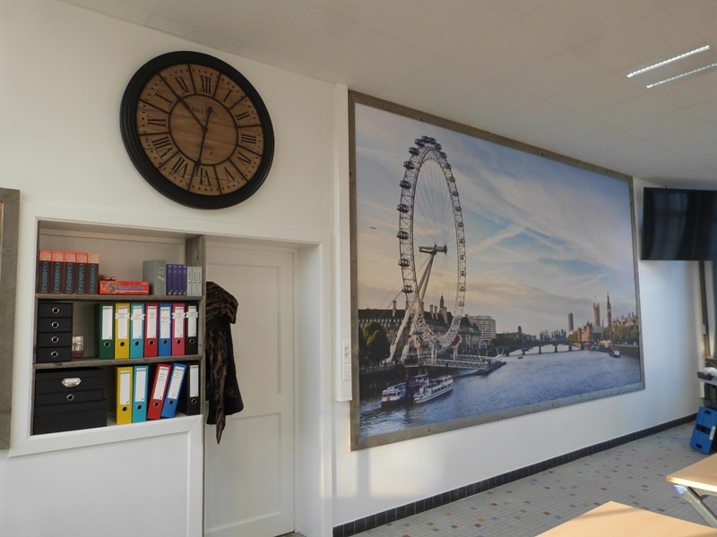 Het klaslokaal dat al een poos zijn wiskundesfeer uit de tijd van de heren Deprez en Luyten kwijt was geraakt, dat de klas was geworden van Tanja Gervoyse, lerares Engels en Nederlands, moeder van Maerlant-leerlingen Robin en Lisa Le Roy, oud-lle 2000, houdt nu wel op weinig opgemerkte doorgangsruimte naar de klas van P. Lips te zijn… door de rustige kleurencombinatie, door het aantrekkelijke, imponerende doek – fotobehang, via Pixers besteld, geleverd in zeven delen en door Steven Le Roy mooi naast elkaar gelijmd op de muur met zicht op Londen en door de sierlijke letters op de achterwand