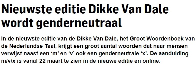 Na bijna 15.000 de-woorden die naar een persoon verwijzen en niet per se naar het biologische geslacht, zal in de nieuwe DIKKE VAN DALE ‘de m, v, x staan.