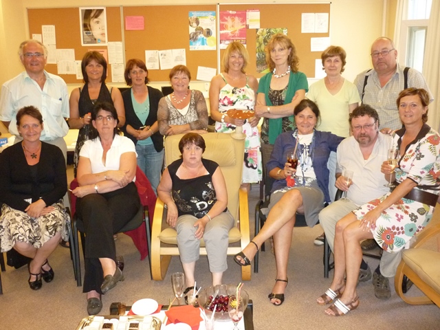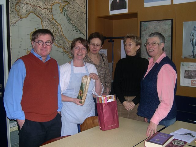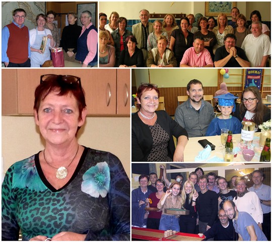 Er was na de middag een beperkte (corona!)viering …maar er waren bloemen, geschenken, een kop koffie en een stukje taart. Enkele collega’s (en oud-collega’s) waren uitgenodigd. De beide directieleden Shirley Adam en Jürgen Balbaert waren er, net als Sabine Dobbelaere (economaat), TAC Gil Jonckheere en administratief medewerkster Kathleen Vinck.