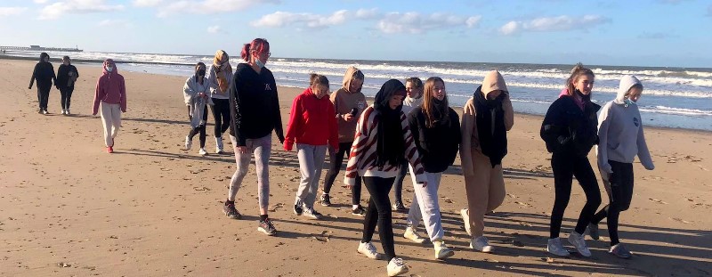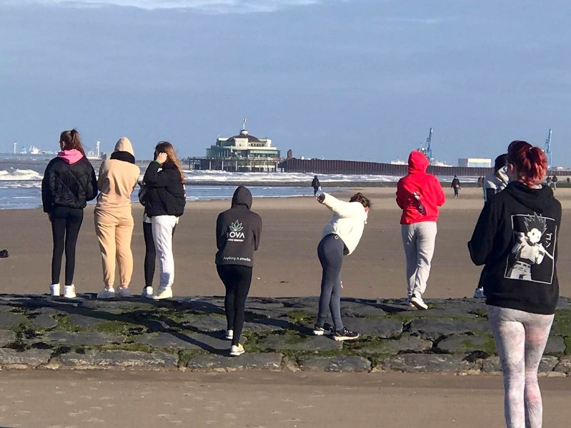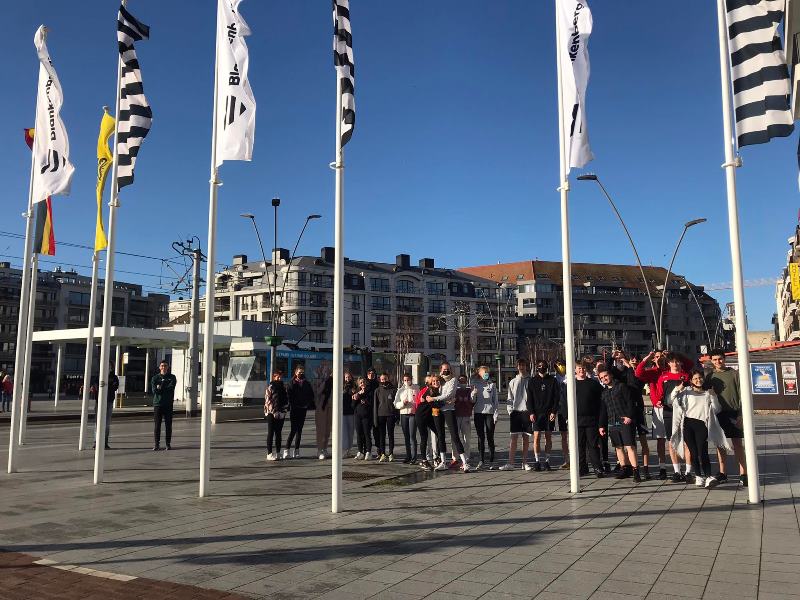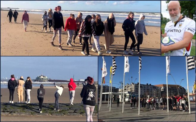 Hij schrijft me: We are Blankenberge! Verplicht buitensporten tijdens de “omnicrom”-pandemie. De zesdejaars snelwandelen, voetballen en doen aan pootje baden op het strand.