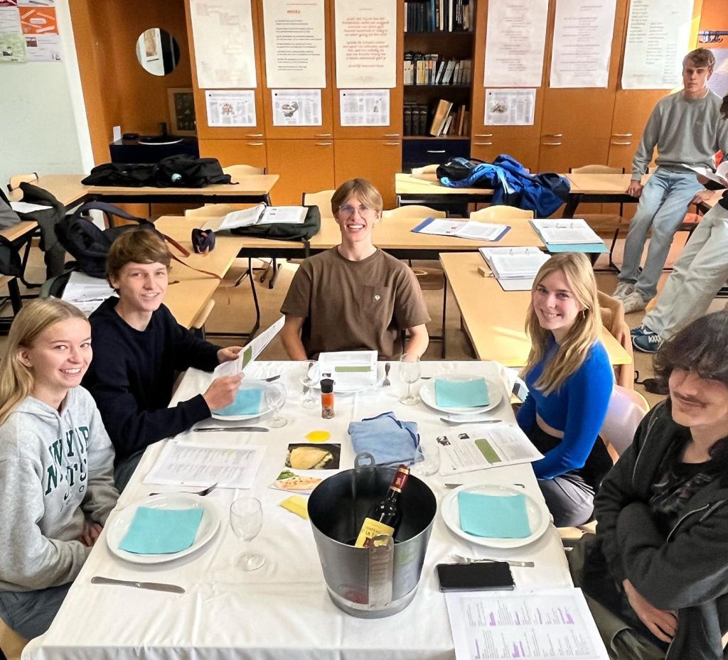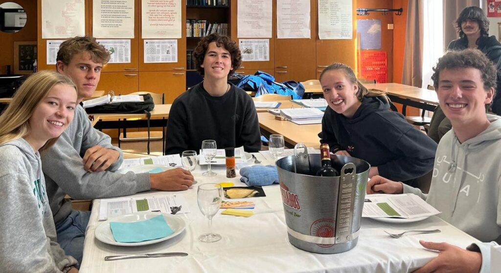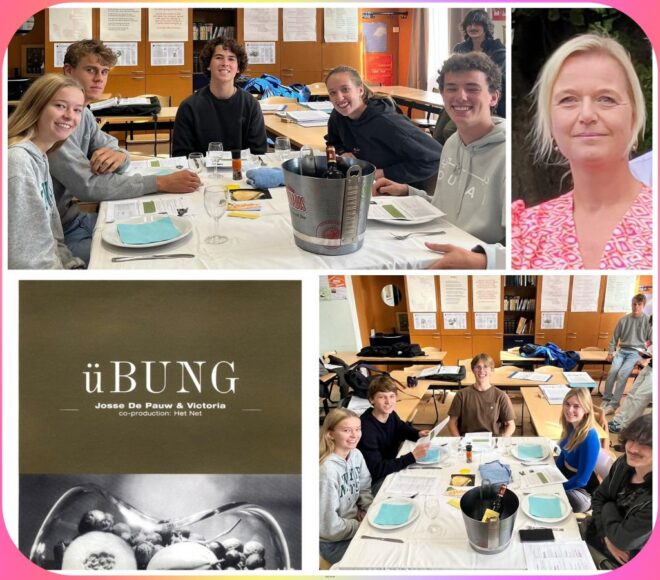 Ze moesten aan de hand van het script en de regie-aanwijzingen zelf de scène uitbouwen met de juiste rekwisieten. Een expressieve lezing van het toneelstuk behoorde uiteraard ook tot de opdracht… Zie hierbij Rolanda, Ria, Olivier, Ivo en Robert AKA Fleur, Jitske, Thor, Arnaud en Jarne. (videofragmentjes Instagram-pagina Maerlant atheneum)