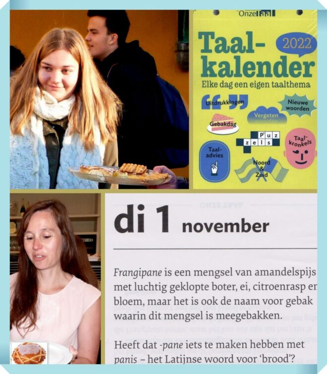 In de ONZE TAAL-kalender 2022, 1 november lezen we dat men vermoedt dat het woord FRANGIPANE is afgeleid van FRANGIPANI, de naam van een Romeinse familie, eind van de Middeleeuwen. Een rijke koopman zou na een Tiber-overstroming met een boot door de straten zijn gevaren om stukken brood uit te delen. Hierdoor kreeg hij de naam ‘breker van brood, wat leidde tot Frangipani. Misschien heeft iemand die zo heette het amandelgerecht bedacht…