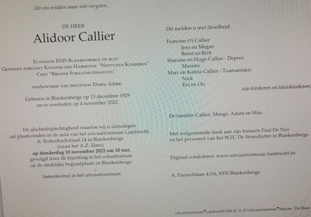 Alidoor Callier, die in 1949 onderwijzer werd aan de Rijksnormaalschool van zijn geboortestad Blankenberge, was vele jaren econoom in de Rijsmiddelbare School Blankenberge. Velen kennen hem ook als de dirigent van de Bremer Straatmuzikanten en als vader van oud-leerlingen Francine (overleden), Marianne en Marc Callier. Hij is de grootvader van oud-leerlingen Jens en Brent Patteeuw, Maxim Deprez en Nick Callier en van Evy Callier.