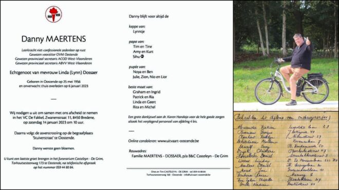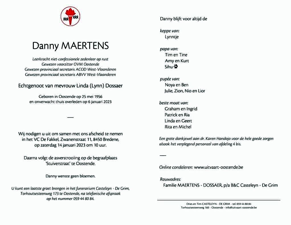 Danny Maertens, oud-leerling (1977) RNS Bl’ge, oud-onderwijzer, oud-leraar n.c. zedenleer, op 66-jarige leeftijd overleden. Onze innige deelneming.
