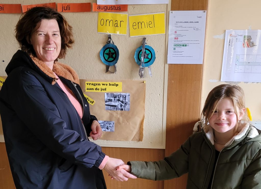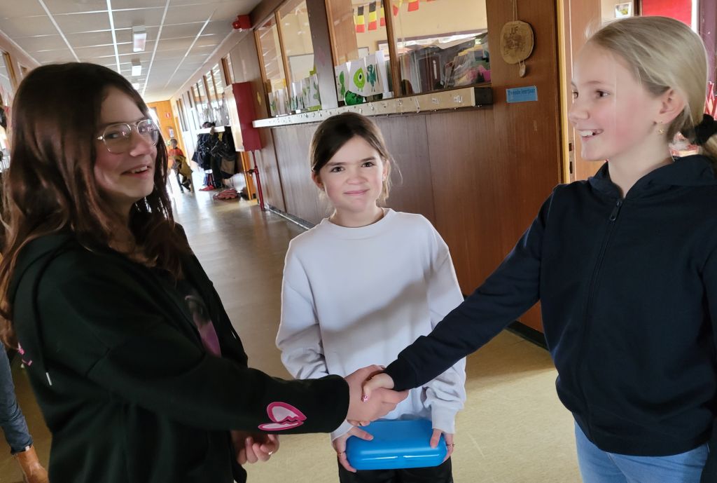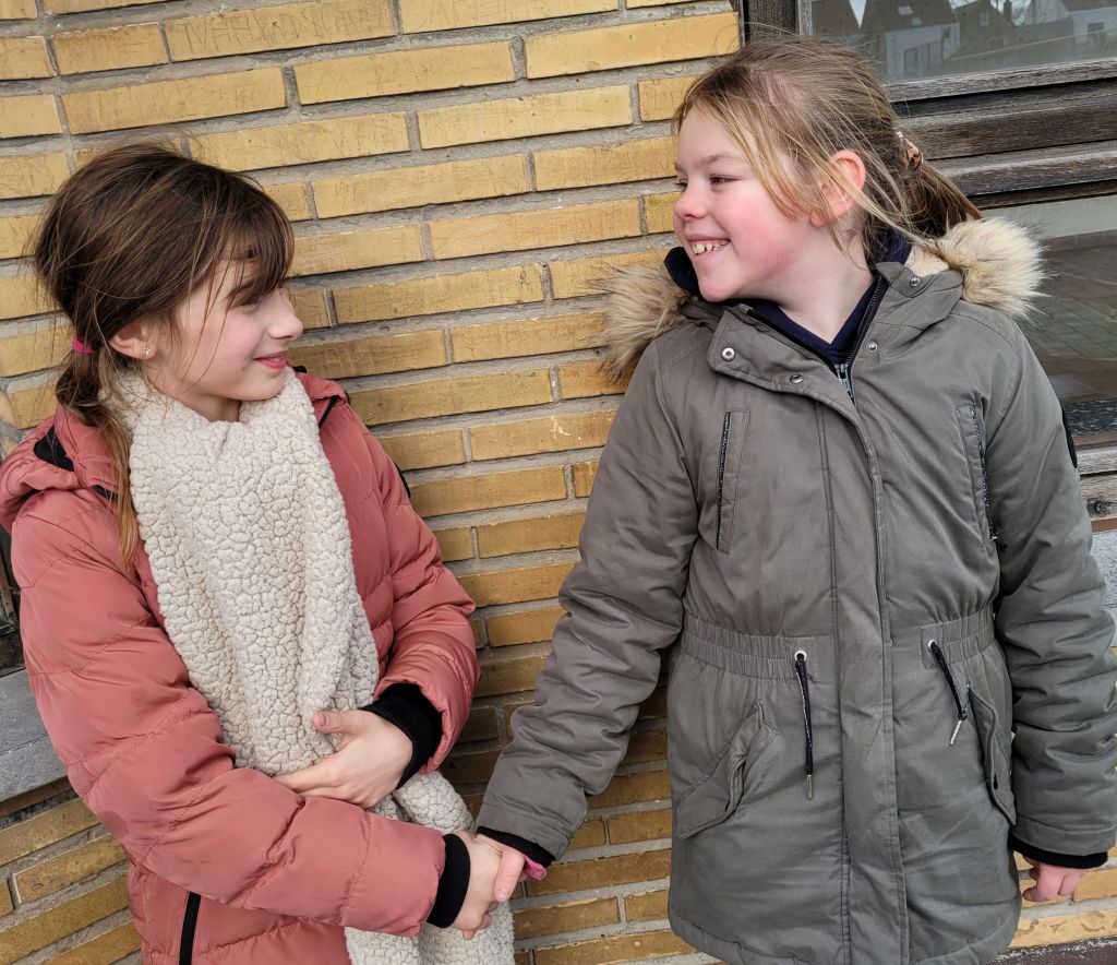 Een gelukkig 2023 wensen: niet meer zoomen, skypen, anderhalvemeterafstandsgroeten… nauwelijks kussen, knuffelen, wel weer handen drukken,  de eerste schooldag van 2023 leerlingen Zilvermeeuw-basisschool.