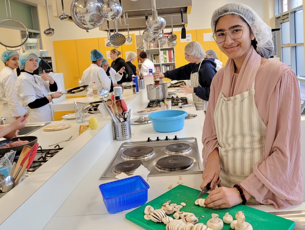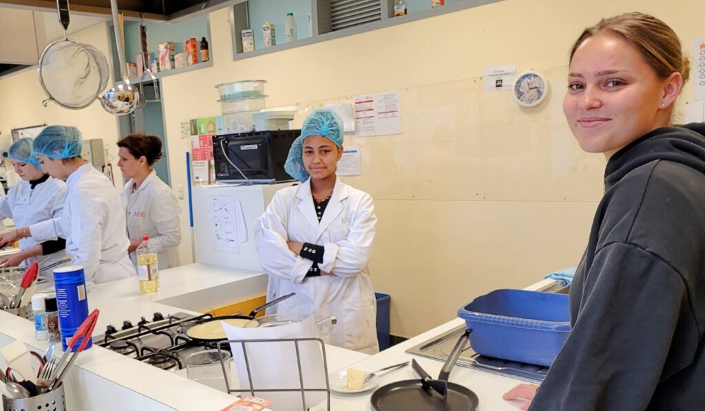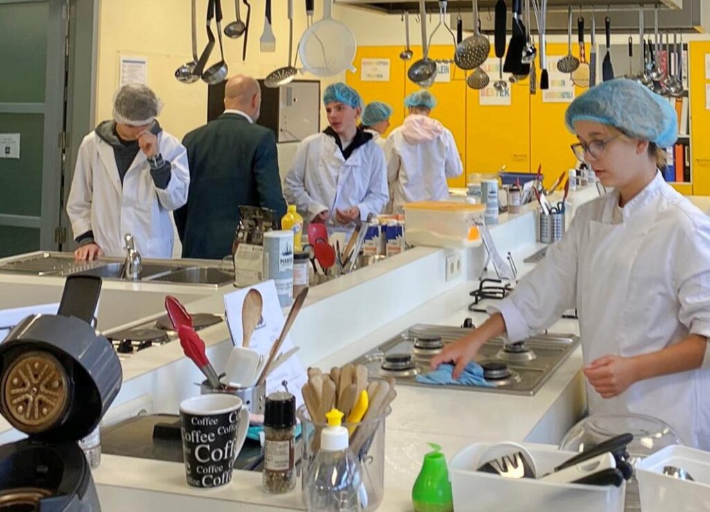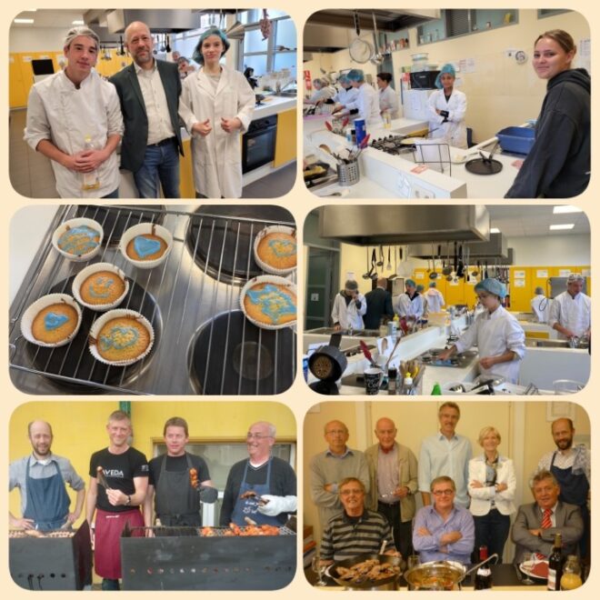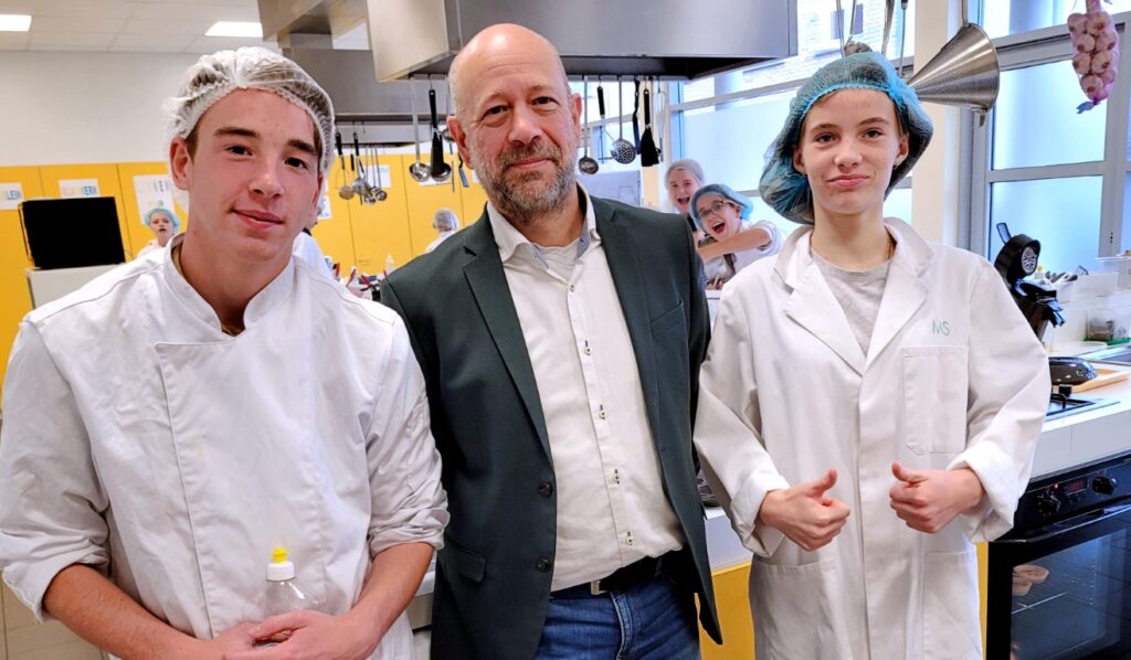 Vooral Marita Bloemen, huishoudkundelerares, collega van Sabine Vervaele, die met ziekteverlof is, staat in voor gepaste vervangingslessen, maar vandaag was zowel dir. Jürgen Balbaert als Britt Wymeels, secretariaatsmedewerkster, in de didactische keuken aan de slag. Beiden hebben wel wat keukenervaring, zij in restaurant Au Vénitien – zij is de dochter van oud-lle Katrien Vergote – hij bij meer schoolse gebeurtenissen als barbecue en een maal voor oud-leerkrachten