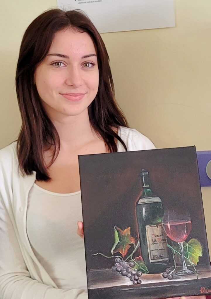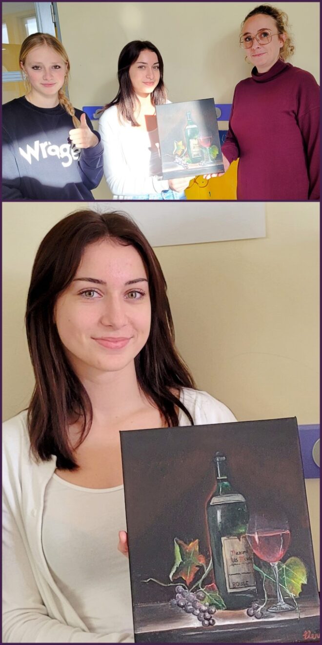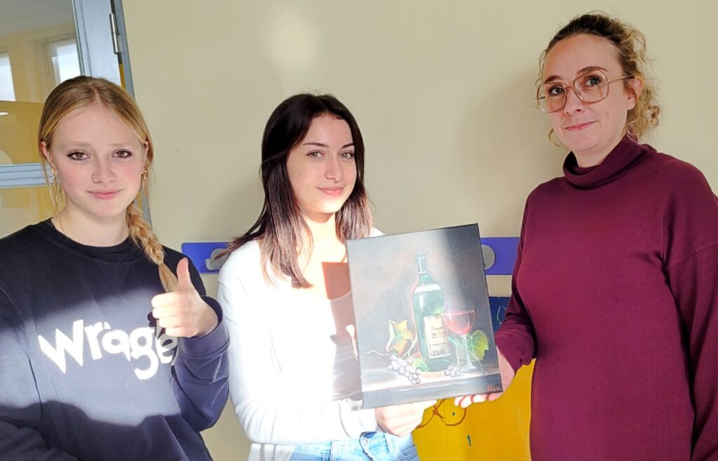 Eleni’s fysicaleraar Olbren Depaepe zag het kunstwerkje, een stilleven met wijnfles, wijnglas, druiven, bladeren en bewonderde het. Hij bracht me op de hoogte. Op het eind van de p.o.-les in 6 STW mocht ik een foto maken van de schilderes Eleni Van Renterghem met haar klasgenote Jade De Block en haar lerares Silke Pluvier.