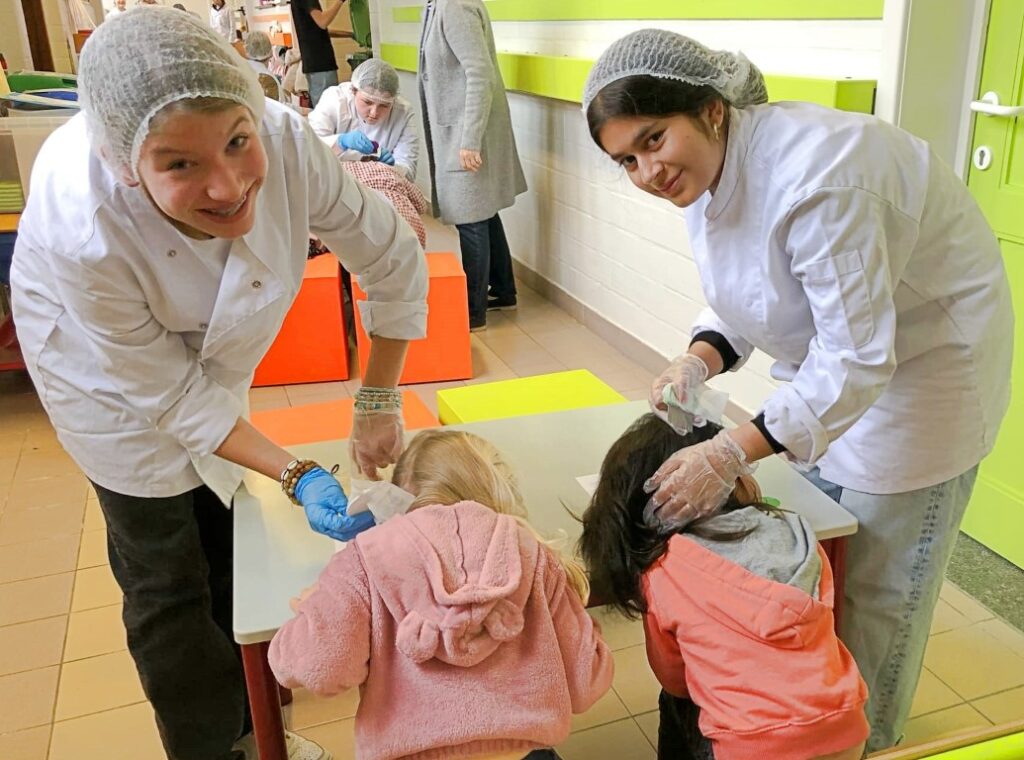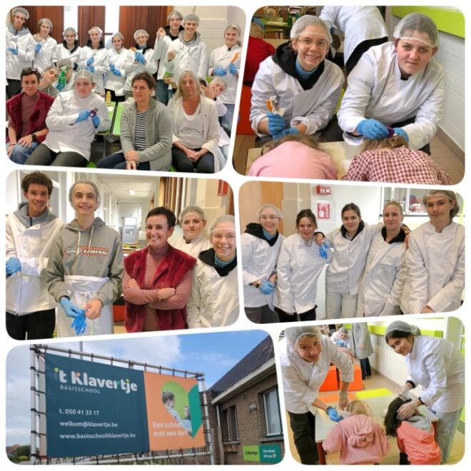 Maerlant-lln. 3 en 4 ZOWE van het Maerlant in ’t Klavertje-basisschool Wenduine voor gekribbel-activiteit (luizencontrole). De begeleidende leerkrachten Sabine Vervaele en Marita Bloemen.