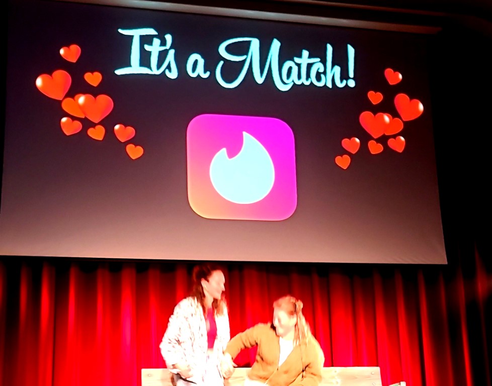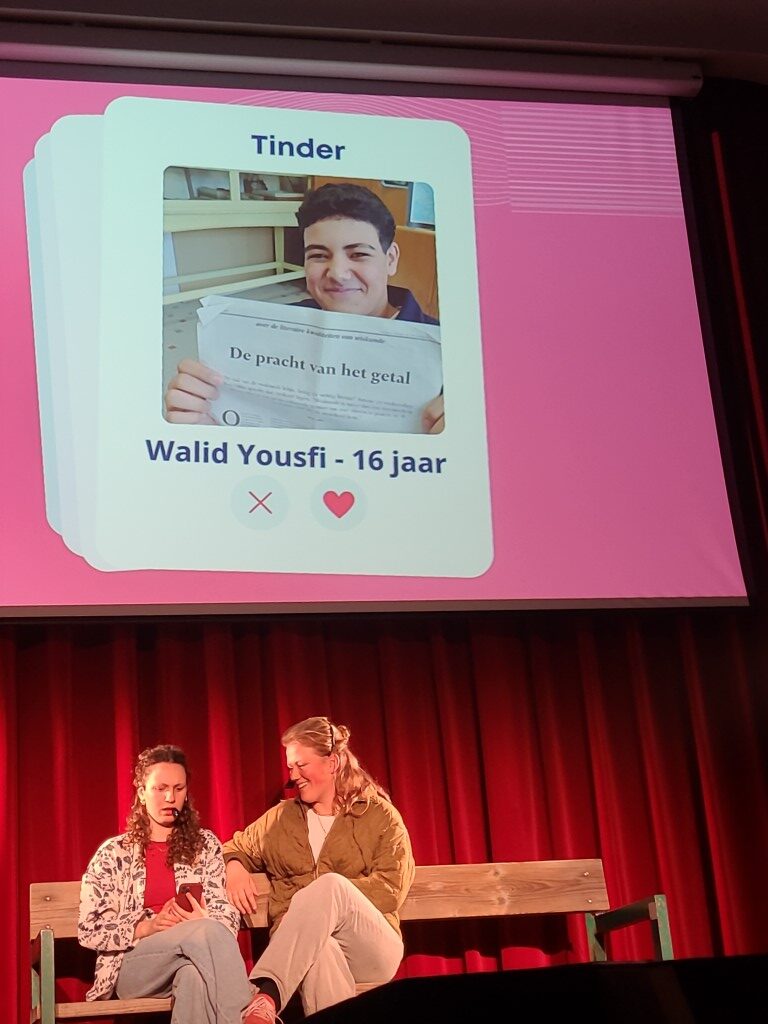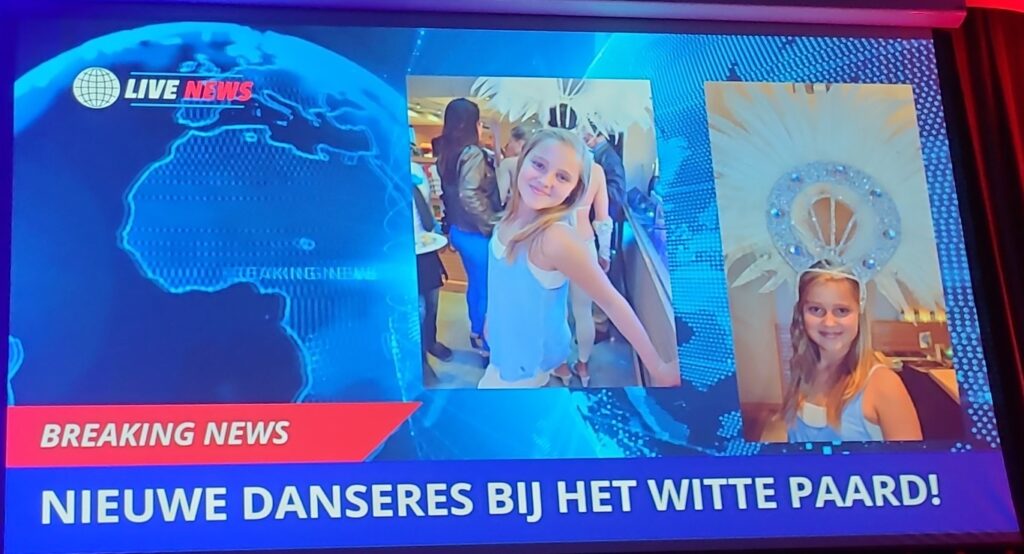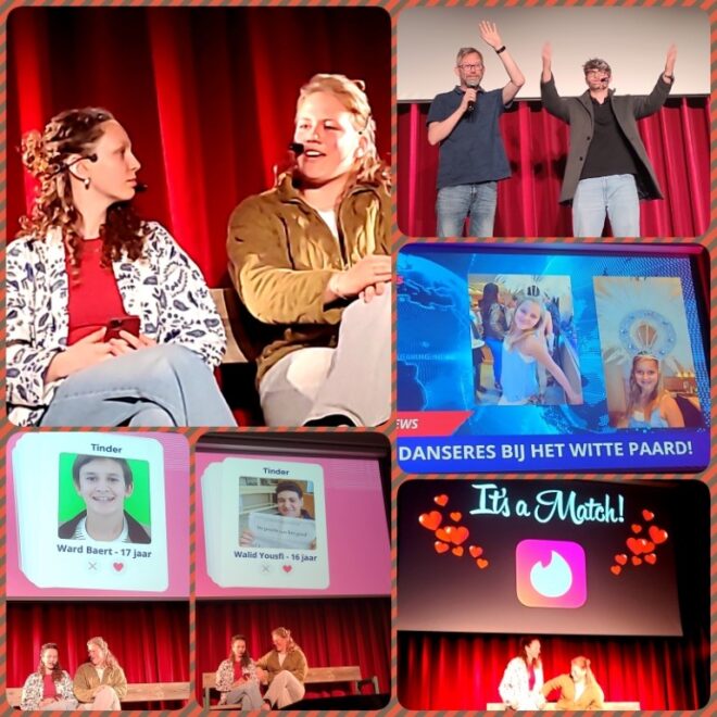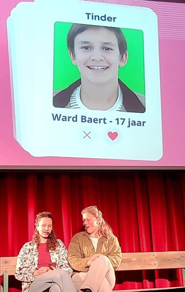 Frieke en Faith op het podium, swipend…Ward Baert, Alexys Sezille, Walid Yousfi, Kyandro Croos, Lander Bullinck, Briek De Leu