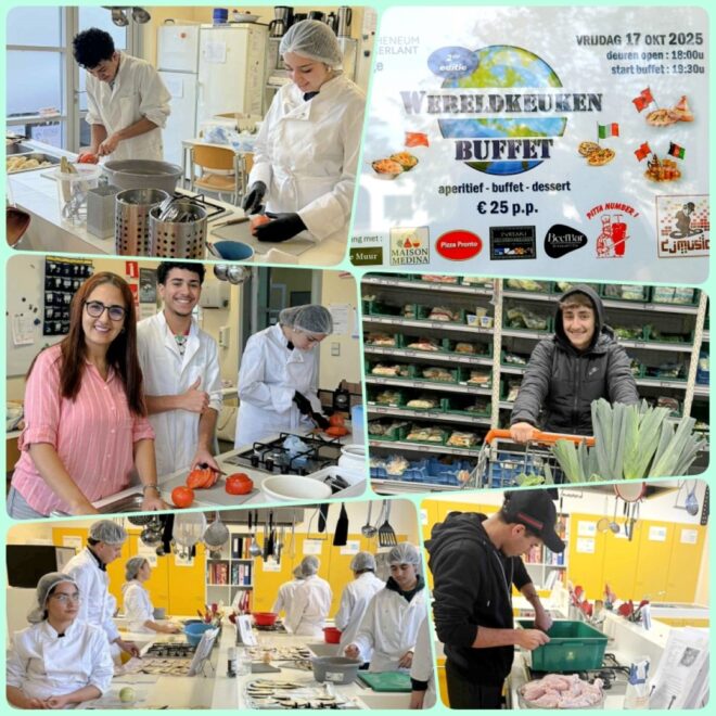 In het kader van de lessen wereldkeuken, diversiteit en armoedebestrijding organiseert het MAERLANT-ATHENEUM op vrijdag 17 oktober 2025 een heuse culinaire avond op school. Een aantal leerlingen, leerkrachten en ouders sloegen de handen in elkaar om een uitgebreid buffet aan te bieden in het schoolrestaurant. De gerechten werden o.a. tijdens lessen klaargemaakt. ‘s Avonds kon men vanaf 19.00u aanschuiven om van deze heerlijke bereidingen te smullen: Griekse, Marokkaanse, Chinese, Italiaanse en Belgische lekkernijen.