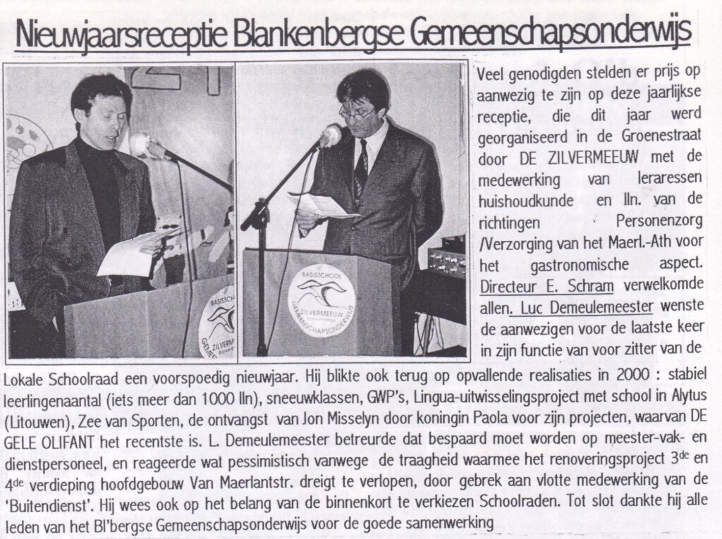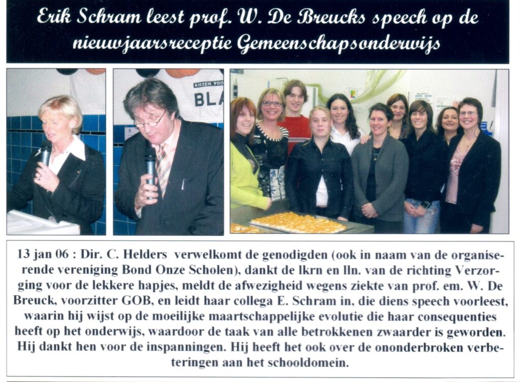 In de jaren ‘80 van de vorige eeuw was het Eric Verhulst, dir. RNS-directeur/studieprefect KA Bl’b die voor het eerst alle personeelsleden van de basisscholen, de middelbare (RMS en KA) en de hogeschool (RNS) op de nieuwjaarsreceptie inviteerde. Enkele foto’s van 2006, 20 j. geleden.