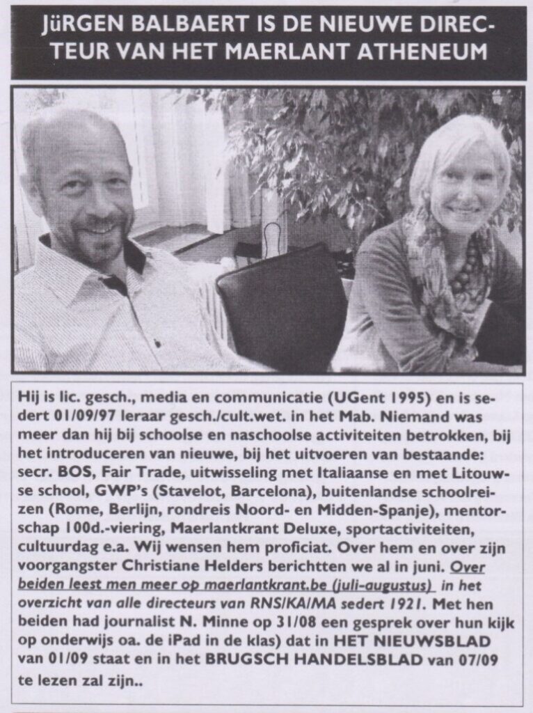 Jürgen Balbaert is bijna 29 jaar verbonden aan het Maerlant-atheneum; eerst als leraar geschiedenis – hij is licentiaat geschiedenis, media en communicatie – en toen directrice Christiane Helders in 2012 met pensioen ging, volgde hij haar op als schoolhoofd.